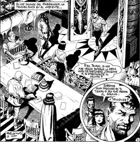 Así, sus primeras historias exhiben un grafismo claramente deudor de los viejos maestros de la EC comics, como Wally Wood o Jack Kamen: figuras contundentes y carnales y un sombreado construido a base de combinar masas de negro y tramas mecánicas. Y entonces, en el número 3 (junio 1987), empieza a incorporar la esbeltez naturalista de otros tres de los grandes, Alex Raymond y su discípulo Al Williamson por una parte y Hal Foster por otra: la línea y las figuras humanas se estilizan y se pone mayor énfasis en el diseño y el enriquecimiento ornamental de las viñetas con multitud de detalles en los fondos, la decoración, la arquitectura, las indumentarias, las máquinas…. A partir del número cinco, el dibujo con el que nos encontramos es ya una impresionante fusión entre Williamson y el extraordinario Frank Frazzetta, con elementos tomados de pintores e ilustradores como Howard Pyle, NC Wyeth, Dean Cornwell o Winslow Homer. Mención especial merecen, por supuesto, sus dinosaurios, que como todo lo demás en este